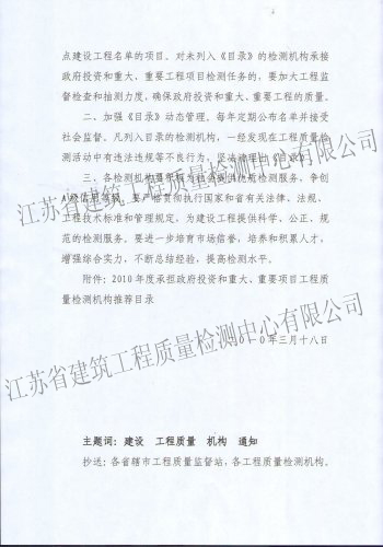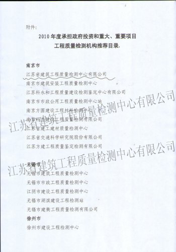 | 被列入“2010年承擔政府重大投資工程質(zhì)量檢測機構(gòu)名錄” |