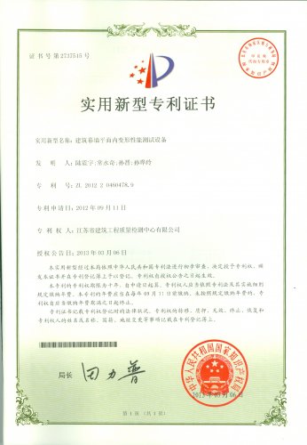 2013年自主研發的“建筑幕墻平面內變形性能測試設備”取得國家實用新型專利授權證書。 |
