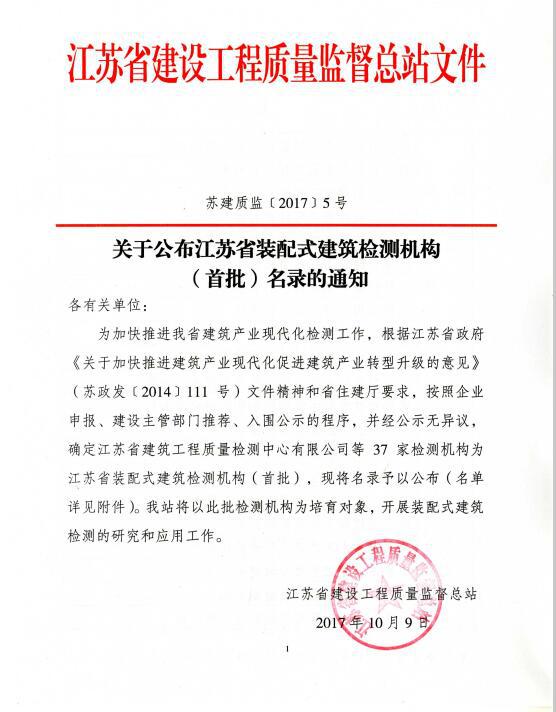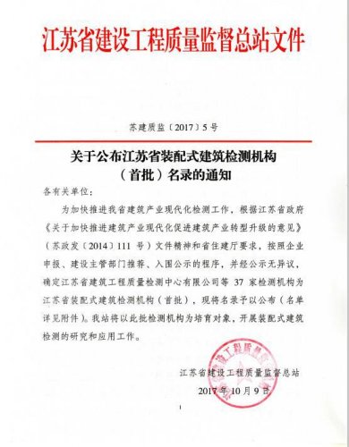 近日,根據江蘇省建設工程質量監督總站《關于公布江蘇省裝配式建筑檢測機構(首批)名錄的通知》蘇建質監【2017】5號的公布。中心作為全省首批符合規定條件的37家檢測機構之一成功入選了《江蘇省裝配式建筑檢測機構(首批)名錄》。 首批入選《江蘇省裝配式建筑檢測機構(首批)名錄》,不僅體現了我中心在裝配式建筑檢測服務領域的實力和經驗,同時也順應了國家政策對裝配式建筑發展,推進建筑產業現代化,促進建筑產業轉型升級的新要求。此次入選,代表著我中心檢測服務范圍的進一步擴大,也為深耕檢測業務挖掘市場潛力奠定了扎實的基礎。中心將積極開展裝配式建筑檢測的研究和應用工作,不斷提升裝配式建筑檢測服務的水平,繼續以高水平的檢測服務,助力全省和全國的經濟發展,塑造省檢測中心極具榮譽的品牌形象。