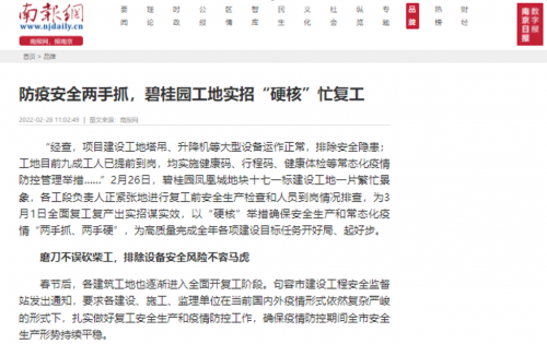 2月28日,《南京日報》以《防疫安全兩手抓,碧桂園工地實招“硬核”忙復工》為題,報道了碧桂園為全面復工復產作出充足準備。文中提到,中心建機部張晶帶領項目組成員認真高效完成檢查,有效助力碧桂園復工復產。